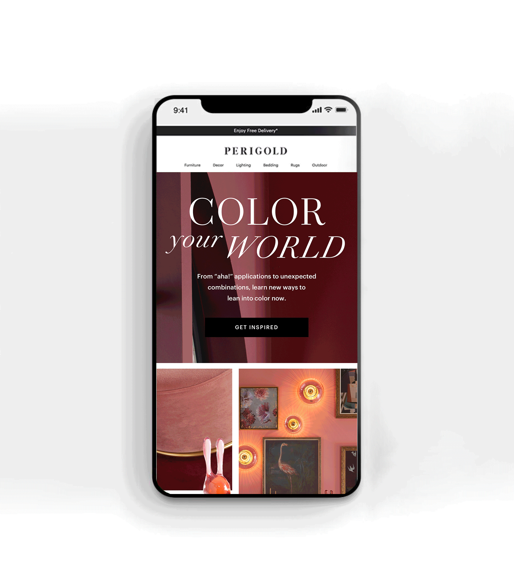 This flex page serves as a source of inspiration for color-curious shoppers while positioning Perigold as a trusted source for design advice. The goal was to conceptualize a page that could be easily be updated to showcase different colors (and their accompanying landing experiences) as needed. We achieved this by sharing quick, actionable tips for decorating with color, organized by color “families.” Each tip is accompanied by a curated selection of products that allow the shopper to easily browse by color.